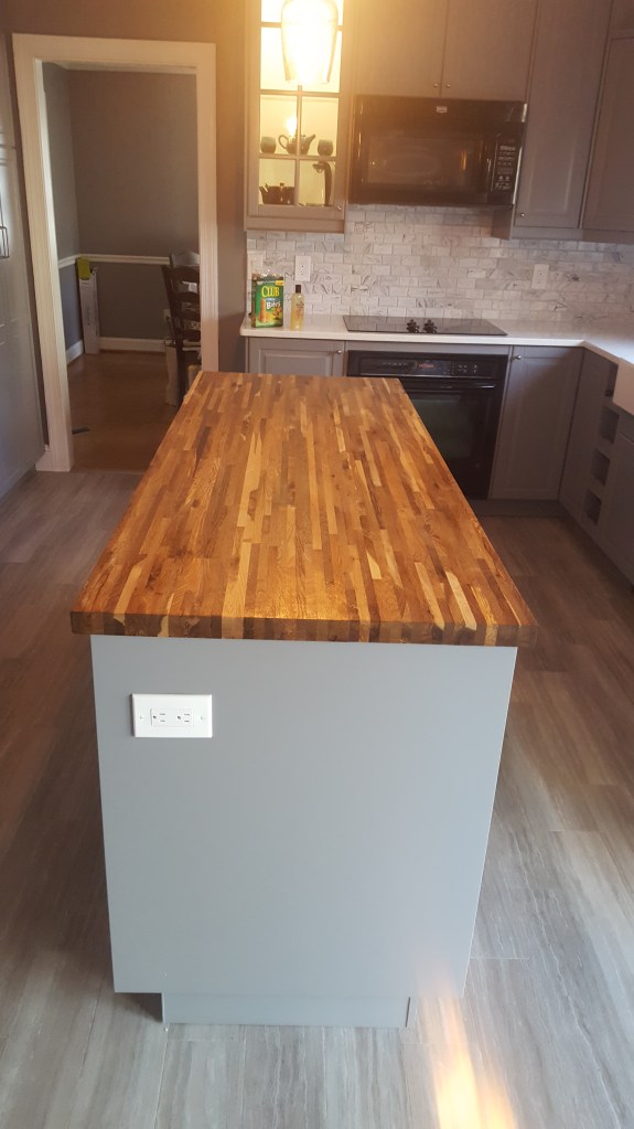 We also got a butcher block countertop from Floor & Decor. IKEA had a walnut countertop that I really wanted. But our island was a little bigger than their standard size, so I had to look elsewhere. I found a really pretty walnut butcher block countertop at F & D that caught my eye, but upon further investigation, that one was sold out.