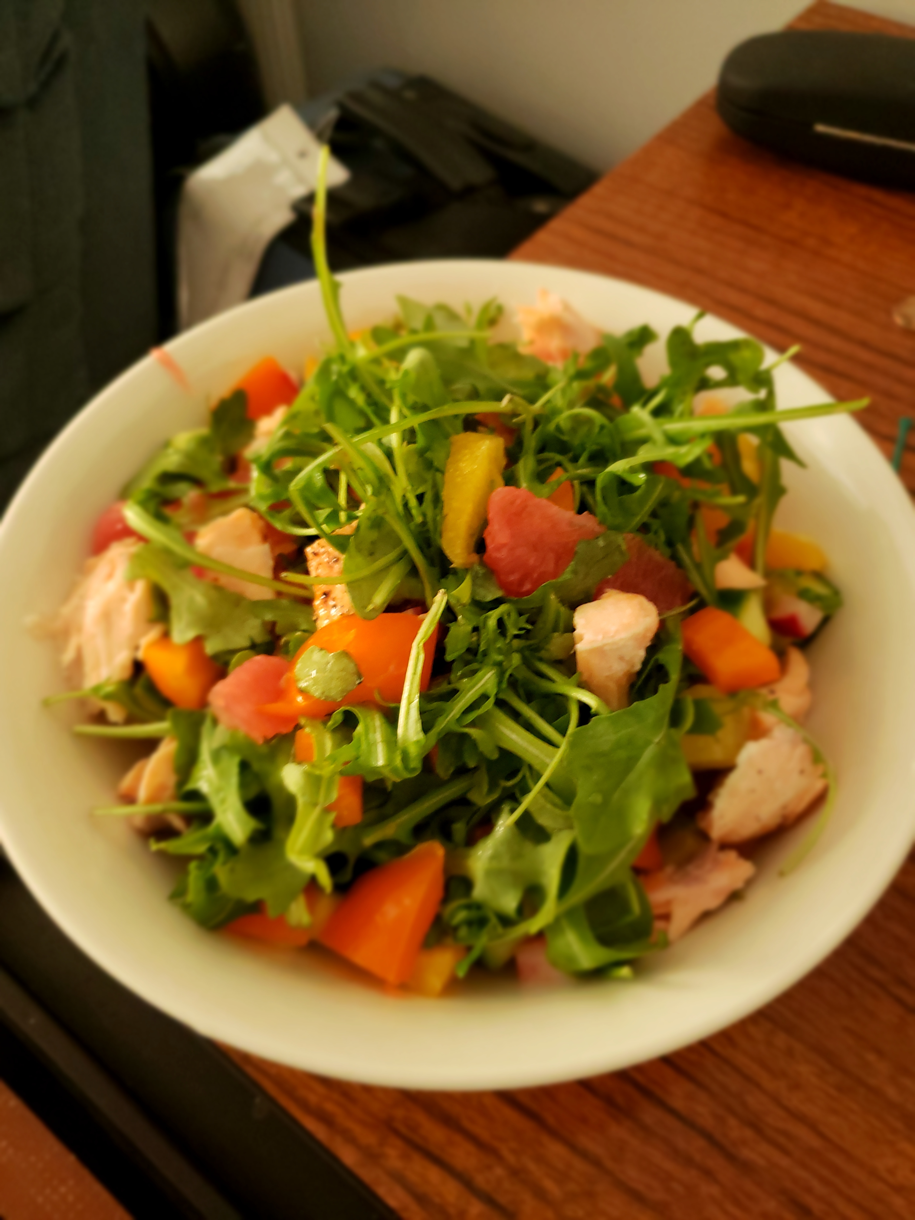 To serve: With the lid to your container securely on, shake your salad so the arugula gets coated with salad dressing. Uncover your salad, flake on big chunks of salmon and toss lightly. Enjoy your penance. I know I did.