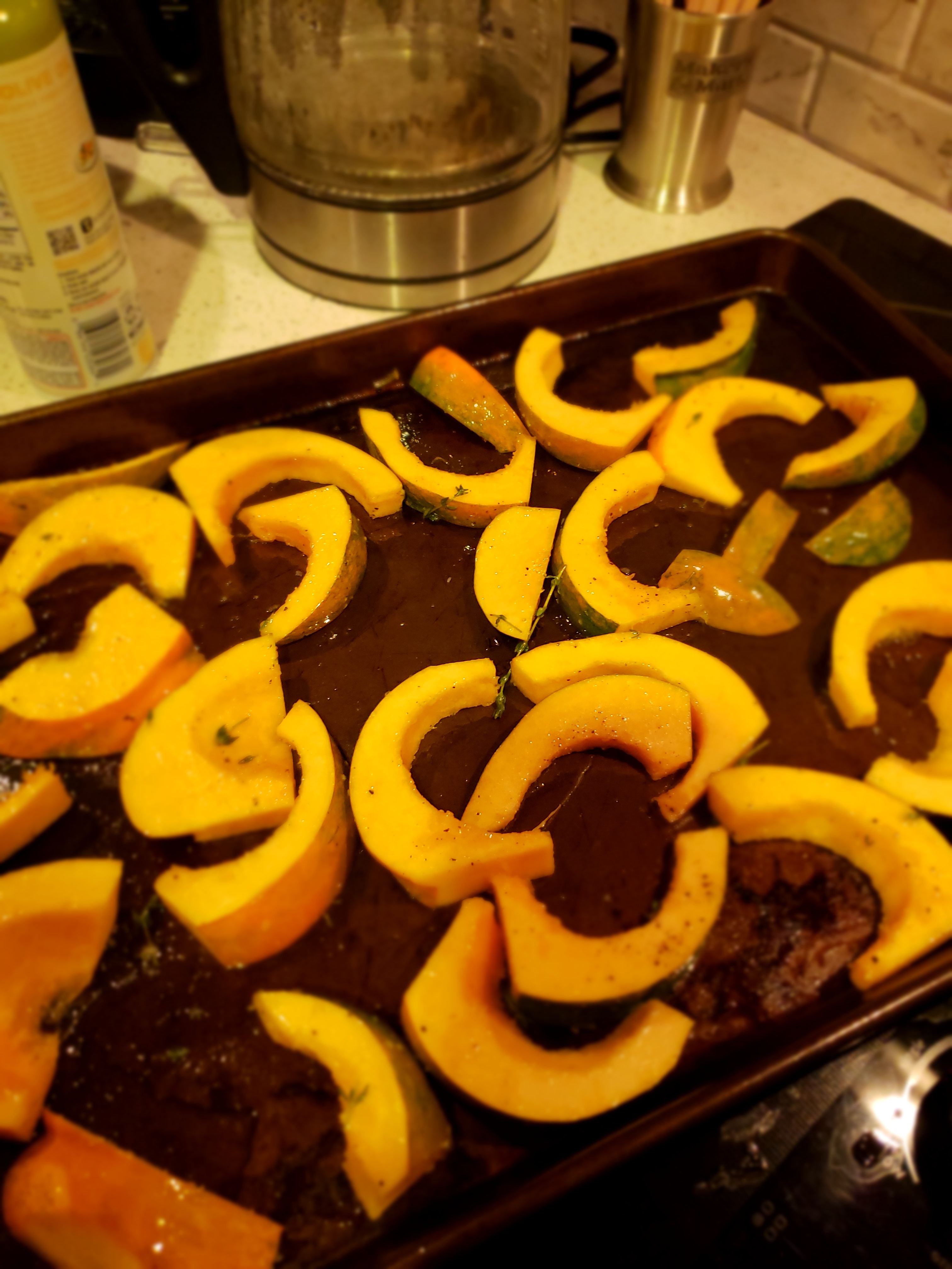 - 2 small acorn squash, seeded and slices in 1/2 inch pieces