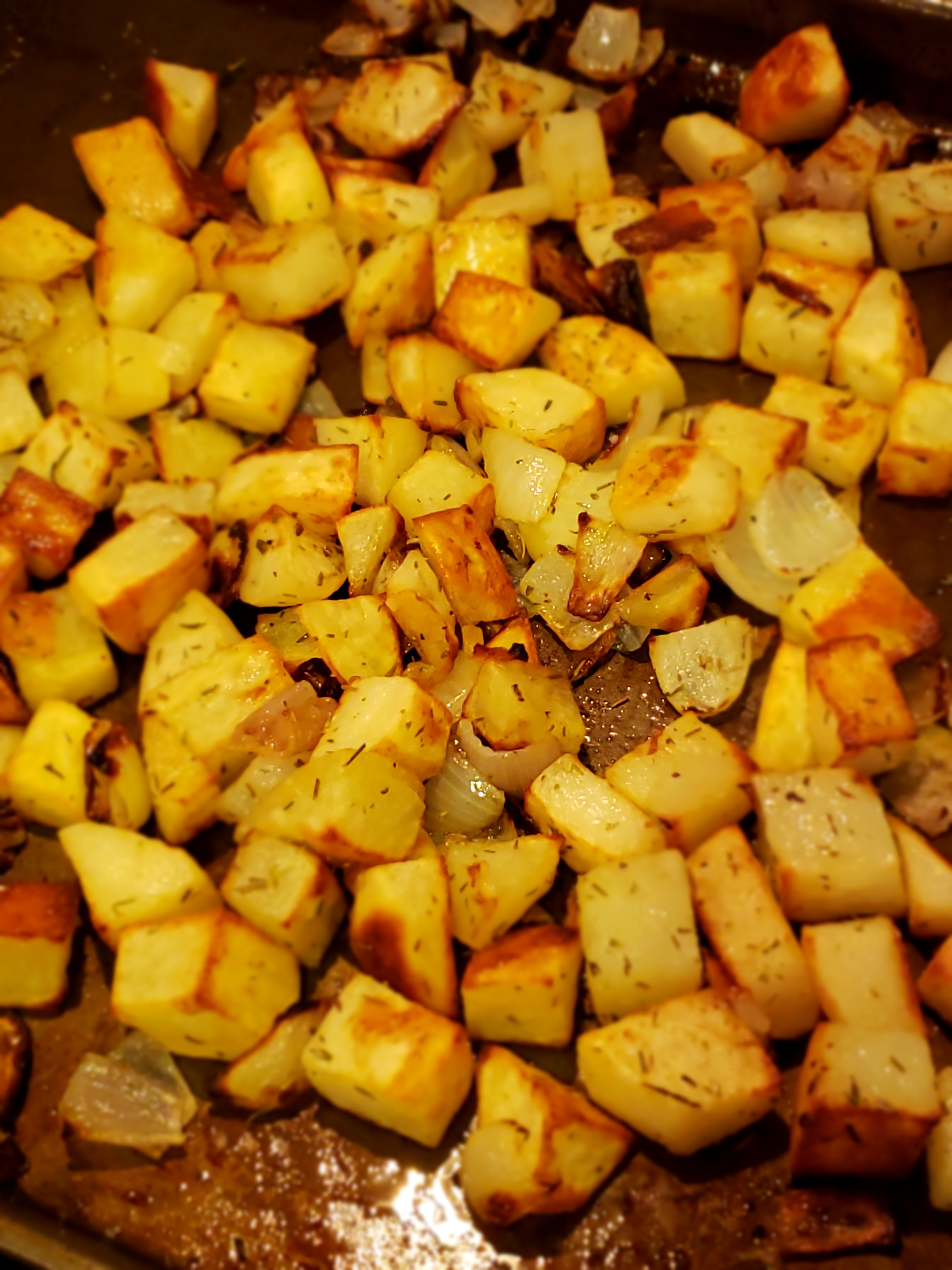 Dice potatoes in bite-sized chunks and add to a big sheet pan (I use 12 x 17). Dice onions and/or shallots to roughly the same size and add to the sheet pan. Sprinkle on salt and drizzle on oil. Toss everything together with your hands. Make sure all the potatoes get coated with oil and seasonings. Spread into an even, spaced-out layer. Roast for 17-22 minutes (depending on the size of your diced potatoes), tossing halfway through the cooking time. Potatoes should be nicely browned and crispy on the edges.