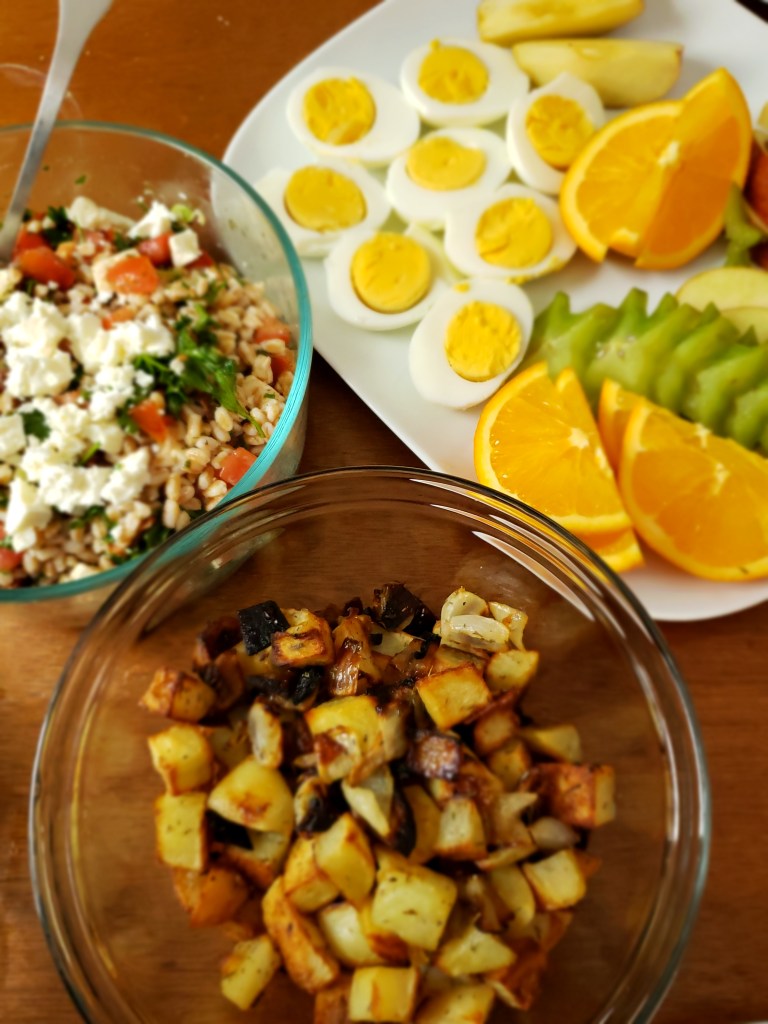 These are a tasty accompaniment to any meal at any time of day. Here, we had them as part of Saturday brunch, alongside farro tabbouleh with feta and dill and a fruit and egg platter.