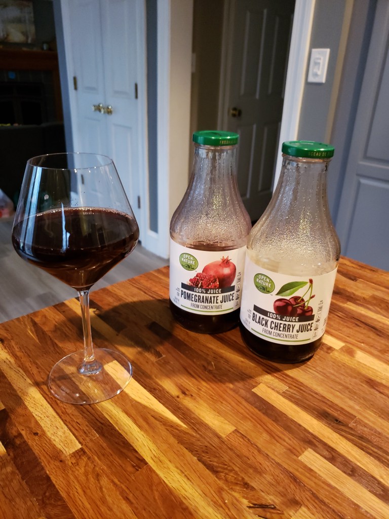 - Cherry-Pomegranate Juice Instead of Red Wine: My local Safeway carries a line of organic, unsweetened 100% juices. In particular, a mix of their black cherry and pomegranate juices were a delightful substitution for red wine. If you like a more juicy, jammy style of red wine (like Zinfandel or Malbec), do two parts cherry juice to one part pomegranate. If you like a drier wine, flip the ratio in favor of more pomegranate and less cherry. Served in a wine glass, they are just as special and adult-feeling as a nice mature glass of wine.